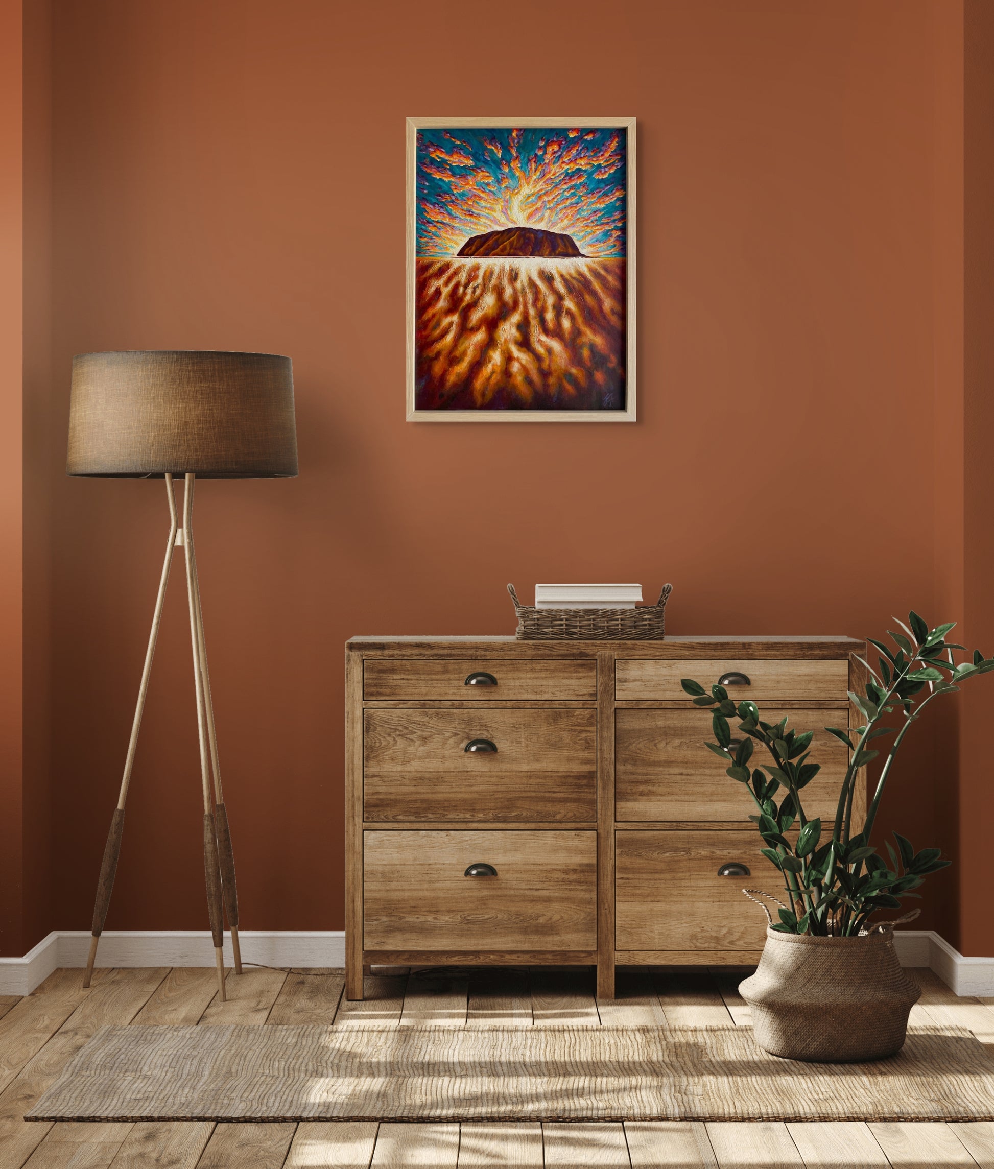 From a vision of the Holy Spirit being poured out upon Australia. Uluru signifies the heart of this great country, and this outpouring going out into all the land.